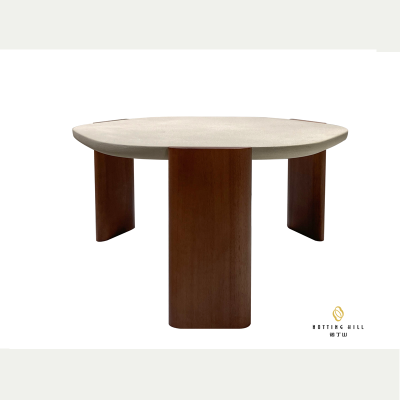 The irregular petal-shaped tabletop is crafted from high-density, matte-finish engineered stone—scratch-resistant, stain-proof, and easy to wipe clean, it offers understated warmth with its neutral, speckled tone while maintaining a sleek, modern edge. Supported by solid walnut wood legs with a rich, dark finish, the tables balance organic texture with robust stability, creating a striking visual contrast that enhances any interior.