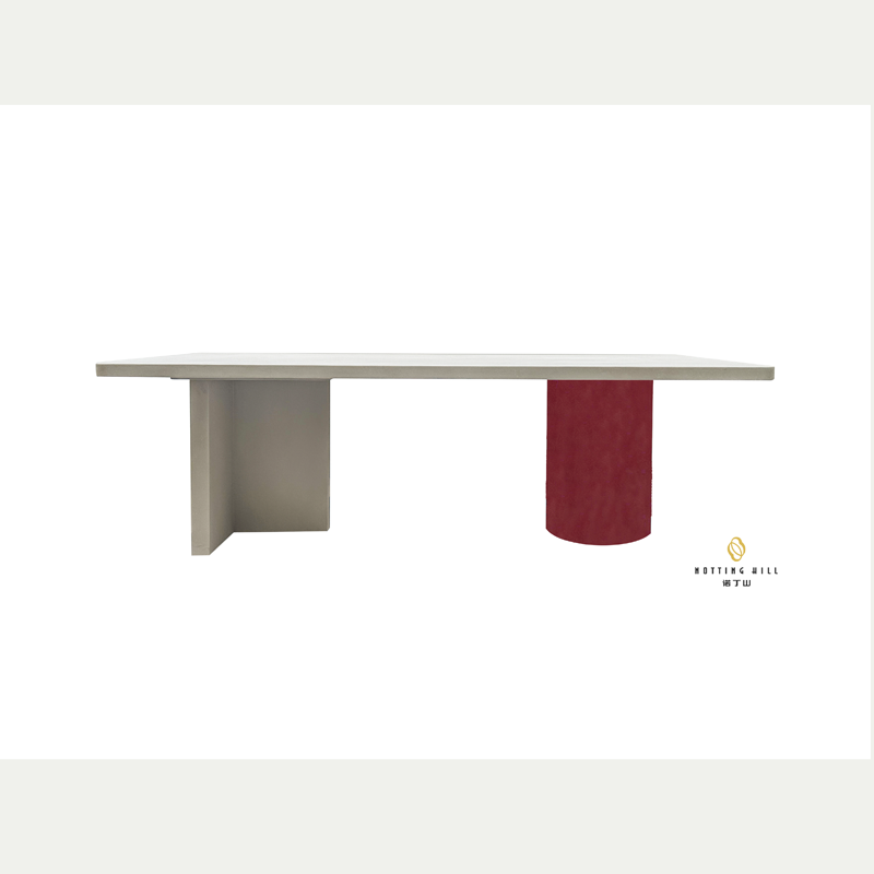 The table’s distinctive support structure combines a light gray L-shaped base with a deep burgundy cylindrical column, breaking the boundaries of traditional symmetrical design while ensuring robust load-bearing capacity and visual intrigue. This intentional asymmetry infuses the piece with artistic character, embodying the essence of natural minimalism and modern luxury.