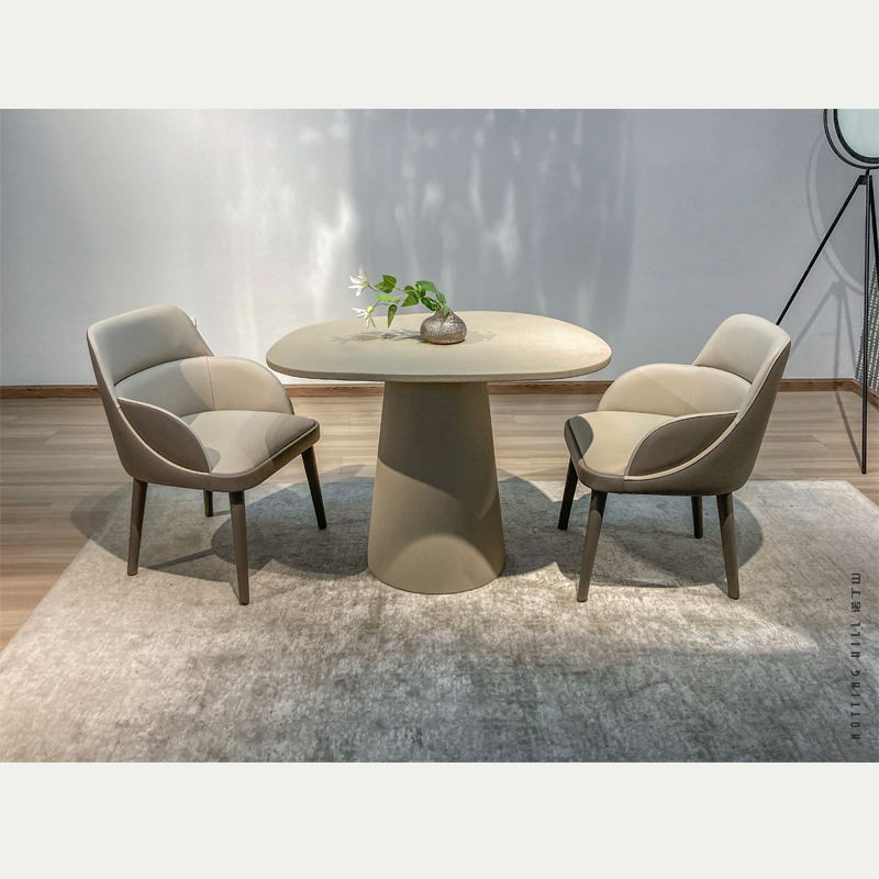 The tapered, monolithic pedestal base replaces traditional legs, creating a visually light, open silhouette while ensuring robust stability and ample legroom. Its seamless, unadorned form embodies the calm, unrefined elegance of Wabi-Sabi aesthetics, breaking the boundaries of conventional dining table design.
