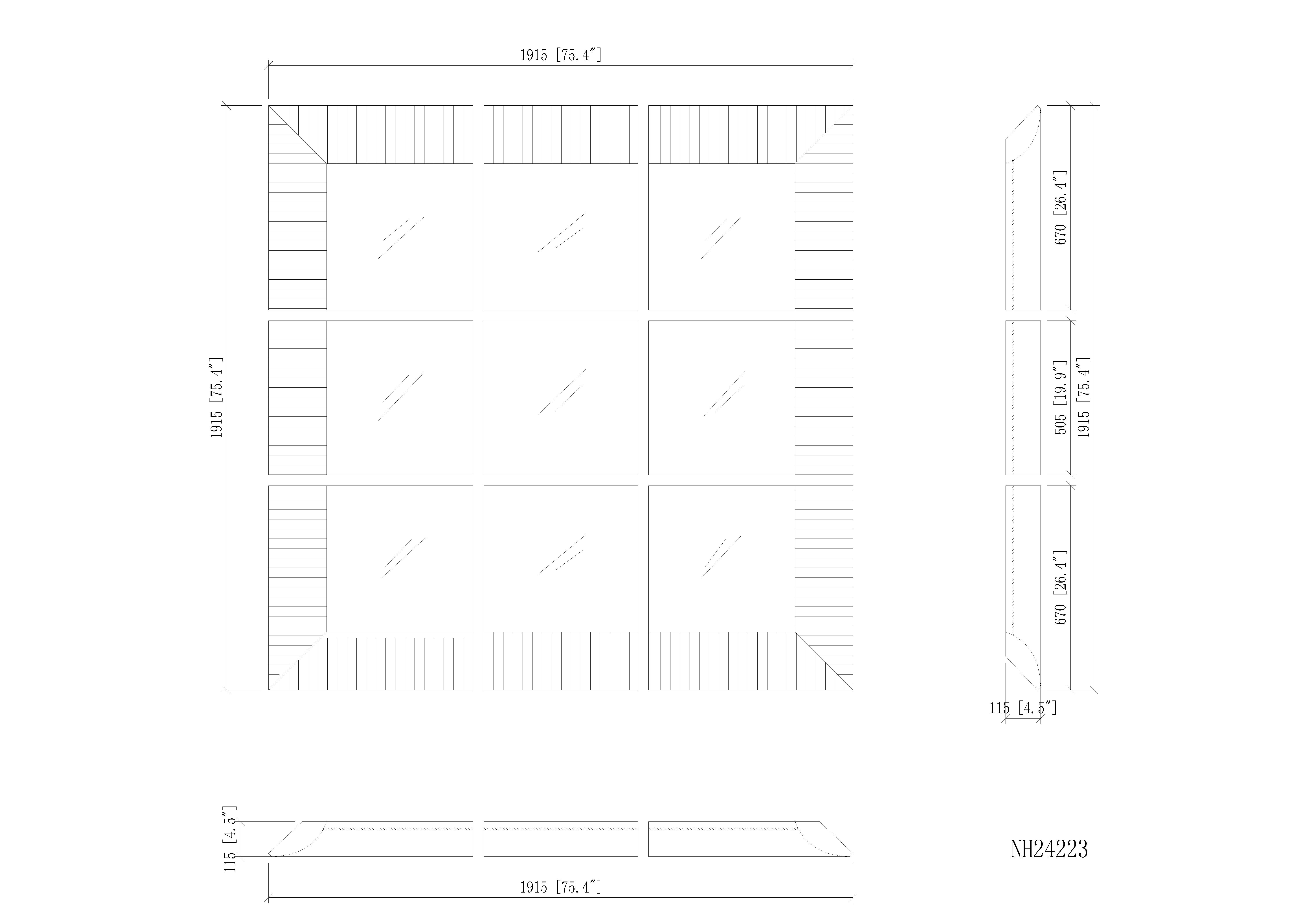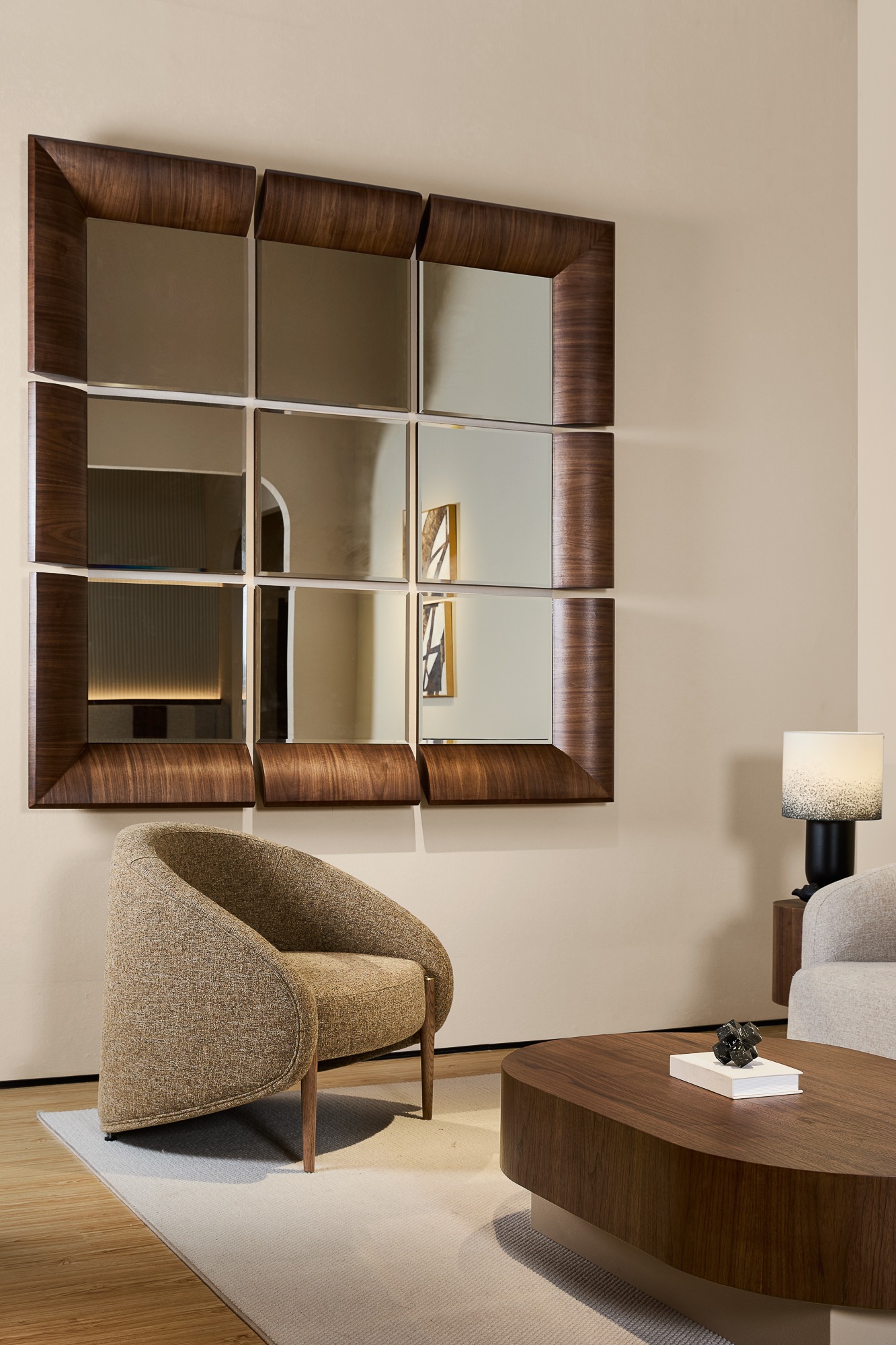 This striking modular wall mirror from Notting Hill redefines decorative wall art, merging natural wood warmth with geometric precision to elevate interior spaces. Crafted from premium black walnut wood for the frame and high-clarity float glass for the mirrors, it features a seamless modular grid design—available in 3×3 or 4×4 configurations—with each square mirror encased in a sculptural, curved walnut border that creates a three-dimensional, relief-like effect.